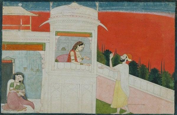 One of seven pictures in the Rothenstein collection from the Punjab Hill state of Guler. This small state played a major part in the development of the great school of painting associated with the parent state of Kangra. This work illustrates the typically Guler use of red backgrounds and shows the Kangra style in its embryonic stages.