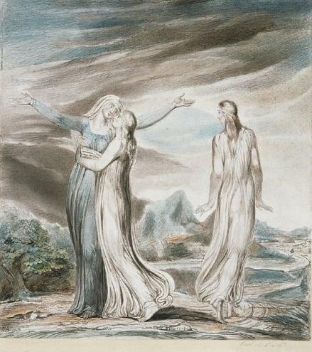 A tall figure with outstretched arms is embraced by her daughter. Orpah, a slender figure in a pink dress, turns away to the right along a road which winds away into the distance. The work is pale and silvery in tone. This watercolour is part of a collection of works by William Blake belonging to the late Graham Robertson and was included in his sale at Christie's in 1949. Graham Robertson, painter, author and theatrical designer, was widely known as a Blake collector. At his death in 1948 he bequeathed 4 Blakes to the Nation; the rest of the collection was to be disposed of by auction. He had, however, left a very considerable estate to be given to charities. This allowed his Executors to instruct the auctioneers that some of the drawings should be acquired for certain museums up to defined limits. In this way 20 works, totalling £40,281 were given by the Executors, through the Art Fund, to 6 public collections.