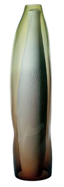 Two piece vase with inner etched white cylinder within outer sheath of graduating colour