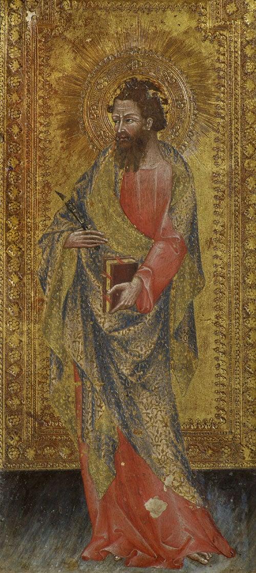 This charming and previously unrecorded example of Giovanni di Paolo's work dates from the early period of the master's activities. It is a beautiful example of Sienese late Gothic painting and, beyond a few obvious damages and a little rubbing, especially in the mantle, is in very good condition, quite free from repainting. The Saint has dark, chestnut-brown hair, and, over a clear-pink robe, wears a grey-blue mantle with whitish lights, lined with yellowish green. The background is gold and the floor a slatey grey-blue.