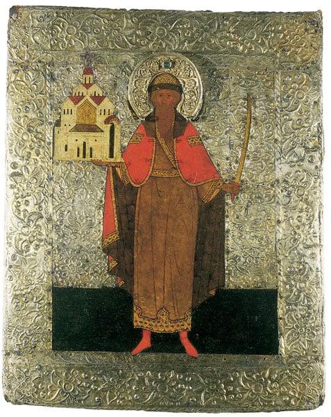 Saint in Russian medieval courtly dress, full length facing the viewer. Holds an upraised sword in his left hand and the Trinity Cathedral, built by him, in his right.
