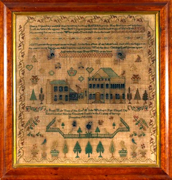 This sampler is both a fine example of late 18th century needlework and one of the earliest known depictions of Wesley's Chapel, the London base of the founder of Methodism, John Wesley. There are few surviving 18th-century depictions of the chapel, making it a rare and important object. Skillfully worked, it includes a variety of motifs and text including Christian verses and a dedication reading: A south west view of Revd Mr John Wesley's new chapel City Road London, done by Elizabeth Ryalls in the 12th year of her age December 19 1798.