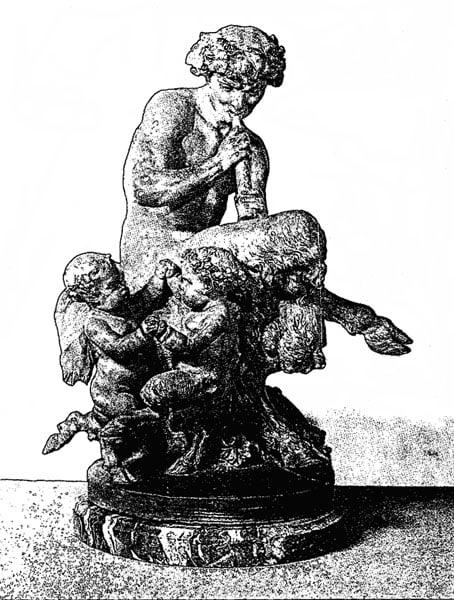 A satyr is seated on a tree stump playing a pipe; while two young fauns dance at his feet. The group has its original griotte marble base.