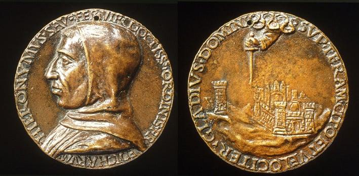 Medal in cast bronze of Giralamo Savonarola of Florentine workmanship: Obverse: Hieronymus sav fer vir doctiss s ordinis predicha rvm; Reverse: Gldivs domini svp ter am cito et velociter. A right hand issuing from clouds and holding a dagger over a city - a quotation from one of his prophecies.