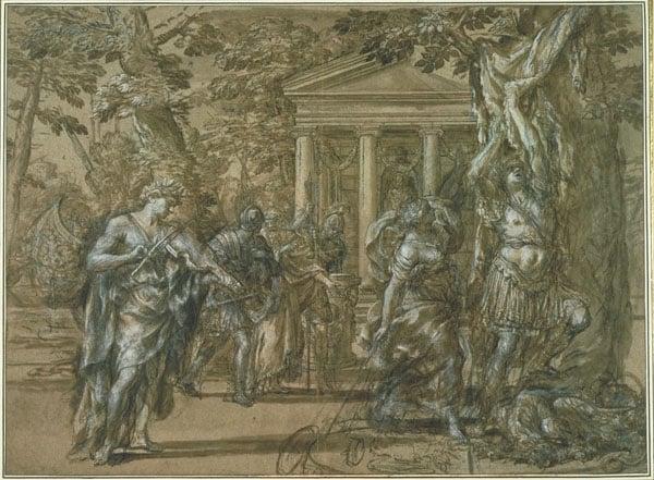 The drawing shows Medea assisting Jason in removing the fleece from the branches of the tree, while the dragon that guarded the fleece sleeps from a potion administered by Medea. On the left stands Orpheus playing a viola, while behind him is the ship Argo. The temple is presumably that of Mars, since the legend related that the fleece was preserved in a grove dedicated to this god. The old man accompanying two of Jason's companions and directing them to the fleece is presumably a priest of the temple. Taken from N. Turner, 'Italian Drawings in the BM, Roman Baroque Drawings', London, 1999.