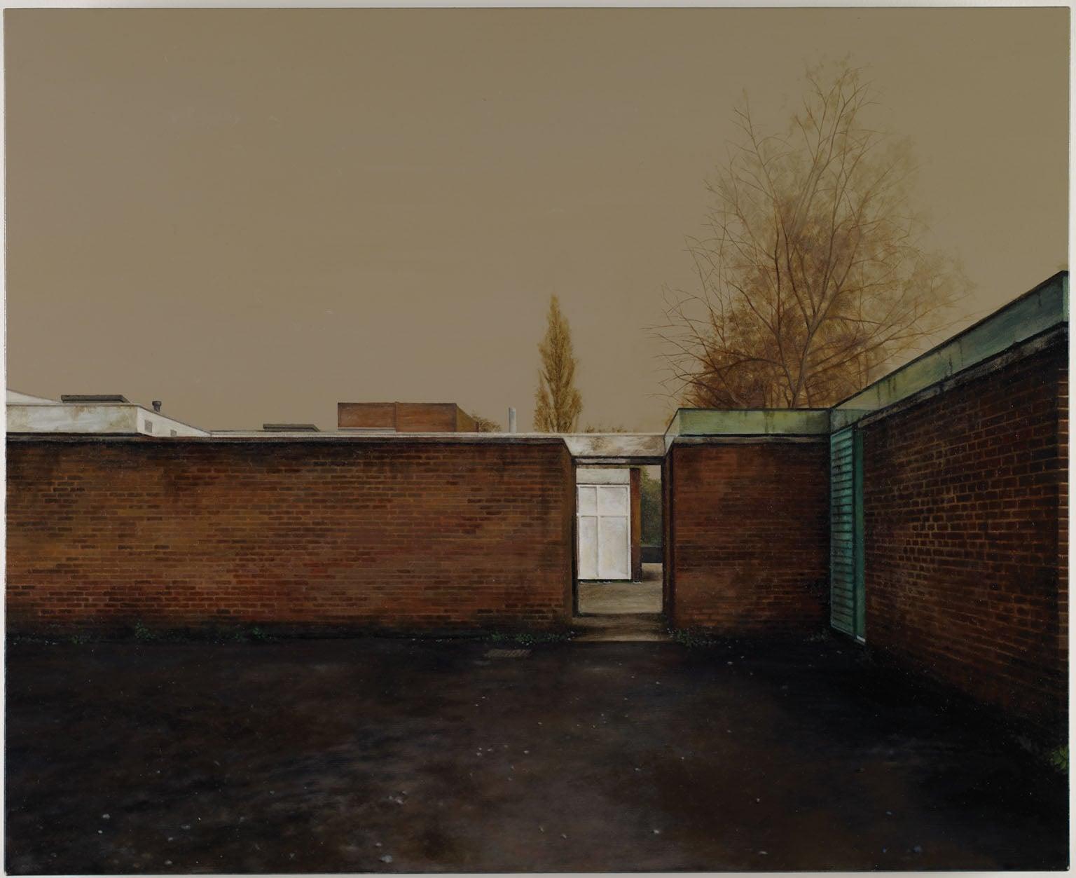 George ShawÂ’s paintings, etchings and drawings, depict the tightly defined area of the post-war Tile Hill estate in Coventry, where he grew up. This work is a vibrant and luminous piece, made by building up layers of the Humbrol enamel paint normally used by model makers. Shaw depicts an ordinary walled area within a residential estate. Apparently mundane, the enclosed space and the uncertainty of what is beyond the doorway give the work a darker, more sinister edge.