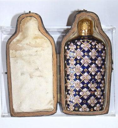 Scent bottle: blue tinted glass with chased gold screw cap; the body cut into diamond facets, with gilt and enamel decoration. In original sharkskin case. Currently unlocated in the collection.