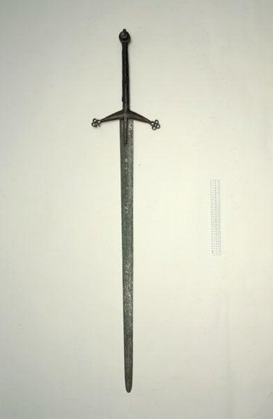 Tall claymore, a two handed sword - a Highland weapon. The hilt has long drooping quillons ending in pierced quatrefoils. The blades were often imported. This example has the 'wheel' pommel, the round mediaeval type, with the original leather grip.