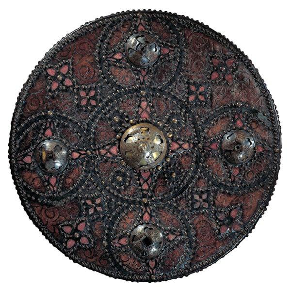 A circular shield consisting of wood covered with tooled leather. The five circular brass bosses are engraved with Highland scrollwork and flowers set over horn liners and pierced with hearts. The central boss unscrews to form a horn drinking cup.