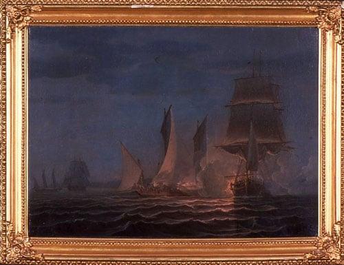 This painting depicts a night battle during the Napoleonic period between a French privateer, a Chasse-Marie and a merchant vessel built by the Brocklebank family of Whitehaven.