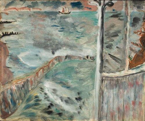 This work is unusual as it is in oil rather than Jones's preferred medium of watercolour. Jones often combined drawing and brushwork, as in the graphic treatment of the sailing ship in the foreground. Here overlapping brushstrokes of differing blues suggest the rhythm and movement of the sea.