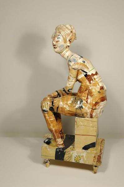 This seated female figure is characteristic of Eglin's hand modelled, cast and assembled forms which make ironic reference to the contemporary world of coquettish poses advertising and popular culture. His post-modern aesthetic is also inspired by the history of art and ceramics, here including the use of yellow glazes (Staffordshire), graffiti-like brush work (Jackson Pollock) and transfer print (commercial china).