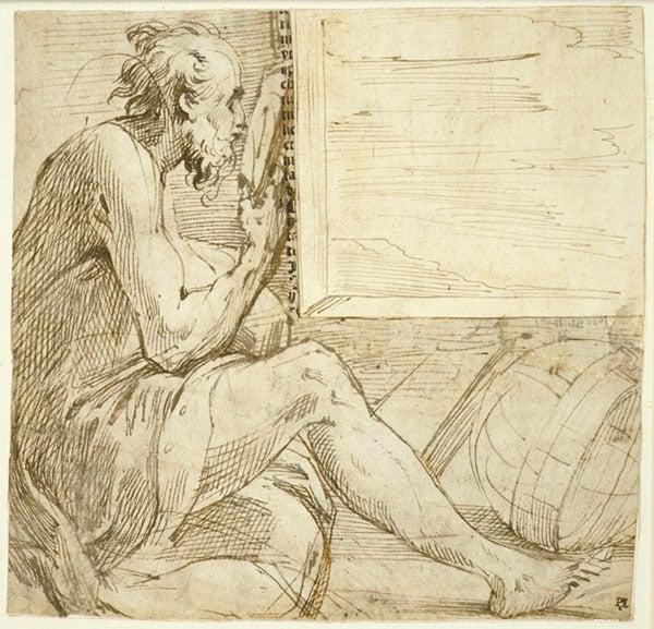 The man sits beside a globe. Part of an album of drawings belonging to Lord James Cavendish MP (d 1741), son of the second Duke of Devonshire (1665-1729), founder of the great collection of drawings at Chatsworth. The collection of drawings form an interesting relic of the great age of collecting in England.