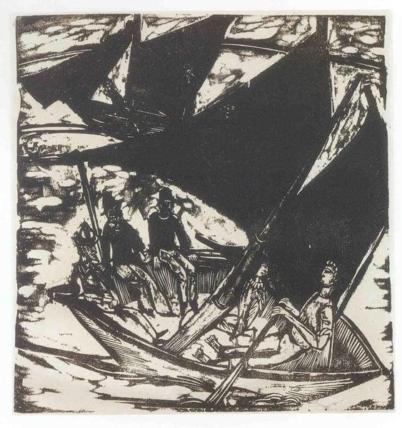 This dramatic woodcut is considered to be among the finest German Expressionist prints of its kind. It shows the artist's wife Gerda with other figures seated in a boat with great black sails, as it moves past the distant shoreline of Fehmarn, an island in the Baltic. Kirchner was the founder of the Die Bruecke (the Bridge) artists' group in Dresden, 1905. His visits to the island from 1908 provided an idyllic alternative to city life where he could be free to develop deeply expressive work of power and energy. The print encapsulates this, with intense contrasts of dark and light and distorted perspective in a taut, segmented composition.