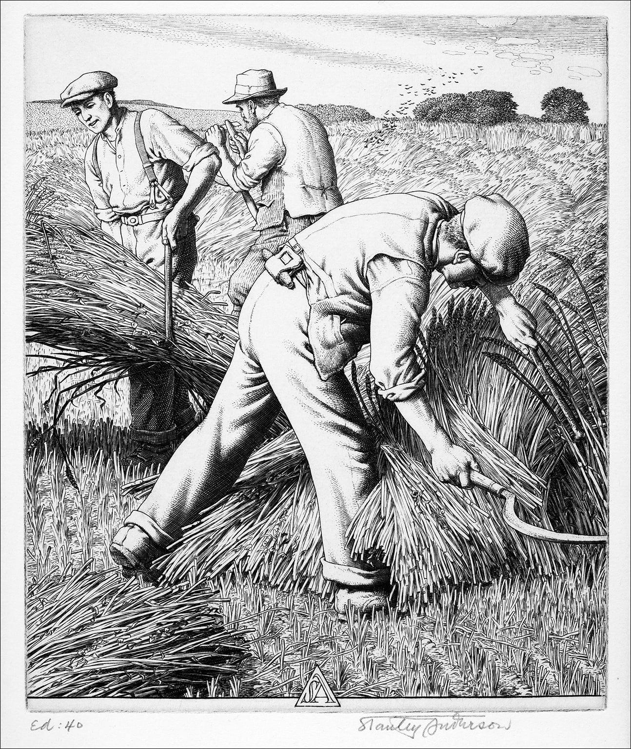This set of engravings belongs to the English Country Crafts series made by Stanley Anderson between 1933 and 1953. In his pictures Anderson sought to record manual tasks and ways of rural life that were thought to be in danger of vanishing. Among the skills represented are thatching, tree felling and rake- and basket-making. Many of the craftspeople featured in the prints have been identified and the collection at the Museum of English Rural Life includes tools that belonged to them. Anderson's pictures now provide handsome illustrations for the ways in which these tools were used.