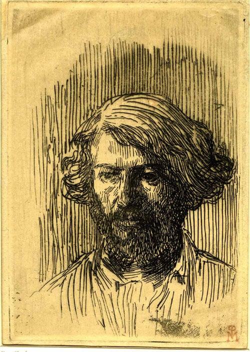 An early self-portrait. This etching on yellowish oriental paper was donated by Campbell Dodgson, who presented 10 works on paper to the British Museum through the Art Fund between 1907 and 1928 and bequeathed a large collection of etchings by William Strang in 1952.