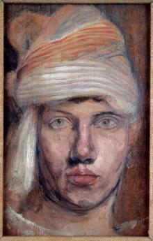 This small-scale painting is the most direct and intimate of several early self-portraits by the artist, showing him at the age of about twenty-four. The warm but low tonality and careful drawing are typical of Grant's extant 1908 to early 1910 paintings, before the impact of Post-Impressionism radically altered his work in 1910/11. Although the striped turban and ear-ring may have been studio props, Grant's appearance reminds us of the numerous artists' fancy-dress balls and parties of this pre-war period, as well as of Grant and his Bloomsbury friends' passion for dressing up for private theatricals. The painting also embodies the artist's alluring and unusual looks which captivated men and women alike, in particular Vanessa Bell, whose close friendship with the painter began about this time.