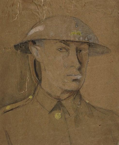 Rosenberg is considered amongst the best of British First World War poets and lesser known as an Anglo-Jewish artist from the Whitechapel area. This is an important work both in the context of Rosenberg’s artistic oeuvre and in view of its biographical context. Encased in steel helmet and tightly buttoned military uniform, Rosenberg’s haggard face stares out at the viewer: a mere ‘outer semblance of himself’. Once he left for the Front, Rosenberg found little opportunity for painting or drawing, and this work, executed in situ in the horrific atmosphere of Somme trench warfare, has a particular poignancy. Although the Ben Uri Gallery has strong links to the local Whitechapel artists, this is the first work directly derived from the experience of the trenches to enter the collection.