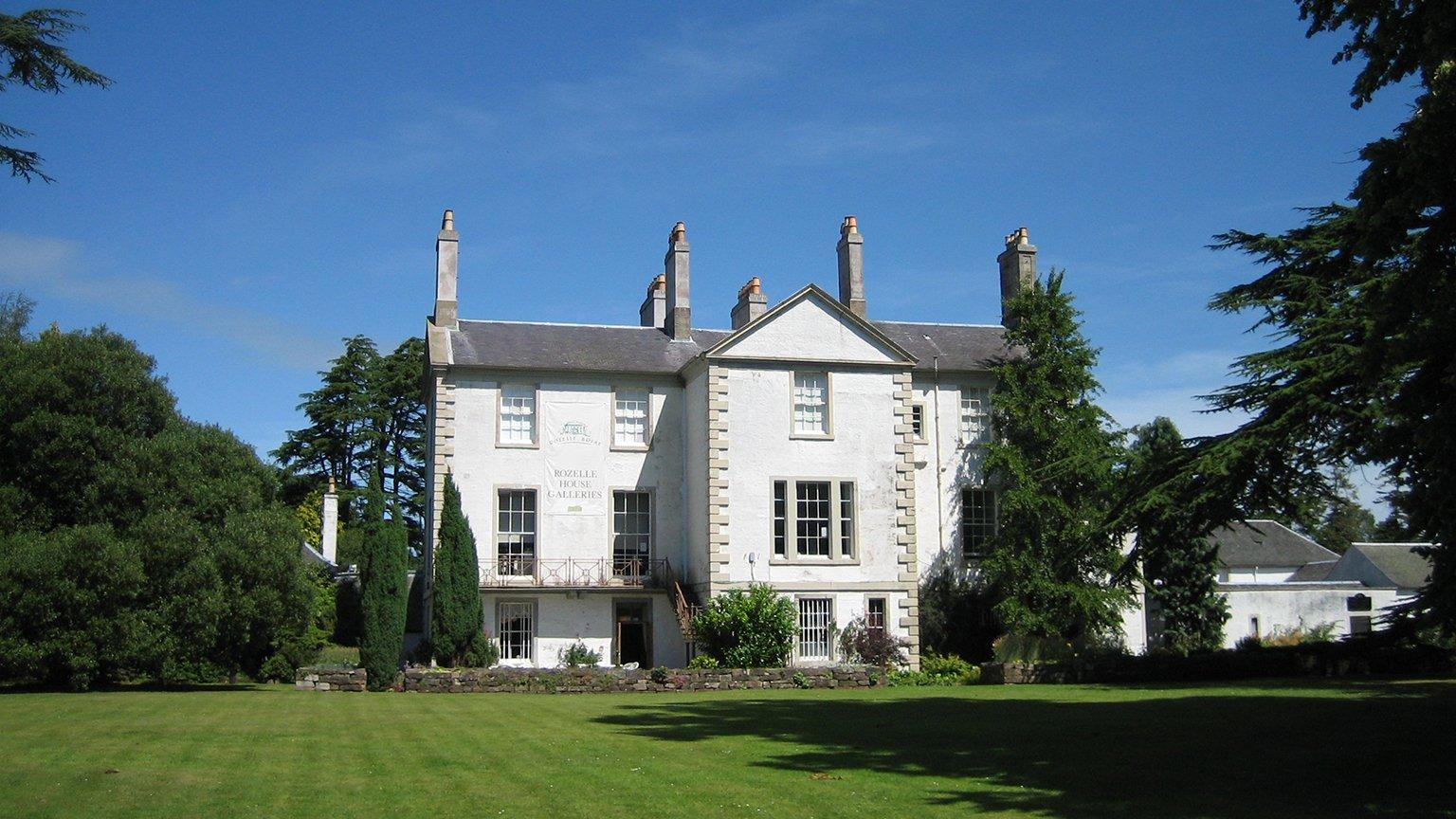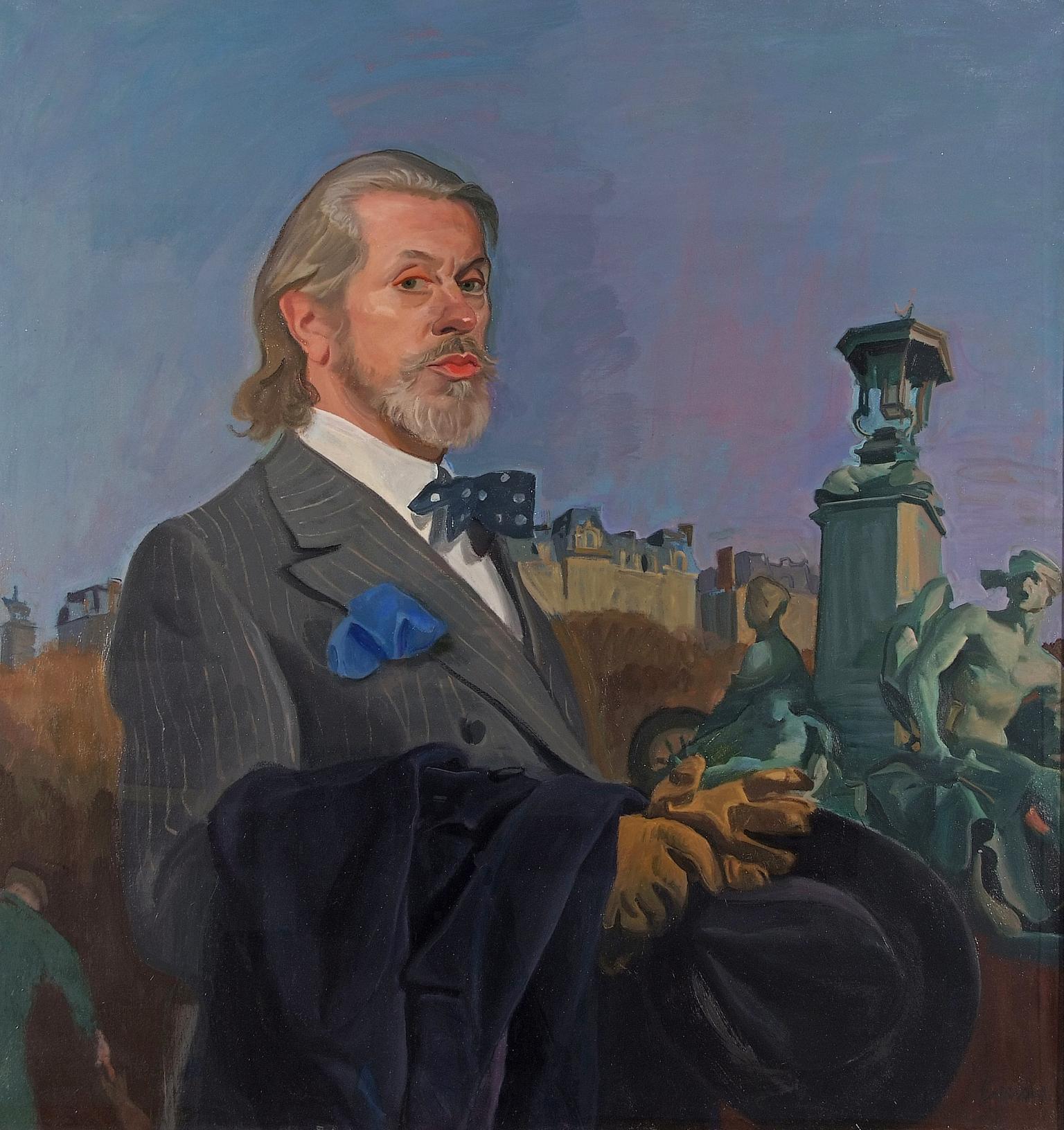 One of Scotland's great figurative painters, Goudie presents himself in formal dress for this outdoor self-portrait, wearing a pinstripe suit and polka-dot bow tie.