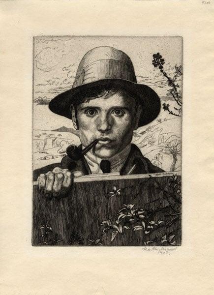Always forging ahead with new ideas and experimenting with different media, Leon Underwood was a non-conformist and pioneer in whichever field he turned his attention towards. His etchings were made over a period of less than five years, yet his brief venture into intaglio printmaking produced some of the finest etchings of his day – notably in portraiture. Drawn directly from life, and distinguished by its remarkably subtle rendering of tone and facial expression, Self Portrait with Hat in a Landscape was one of the very few Underwood etchings to be published in an edition. Sadly, but underlining the significance of this remaining etching, his plates were stolen and destroyed for their value as scrap metal.