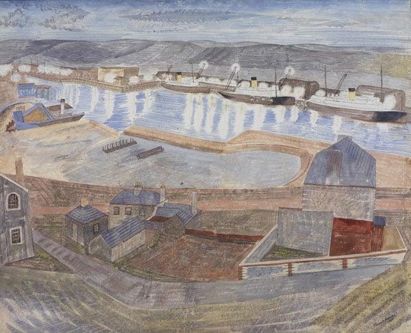 This work depicts the harbour at Newhaven in East Sussex, with three large ships in dock. Despite its industrial subject matter, the Sussex Downs run along the background suggesting a meeting of the rural and functional that is a feature of much of the south coast. Although Bawden spent almost all his time in Essex, he did make occasional visits to Newhaven with Eric Ravilious. The Towner holds the broadest collection of Ravilious' work in the world but only a handful of works by his close friend and colleague Edward Bawden. This work is therefore a welcome addition as it was painted during a joint visit by the artists to Sussex.