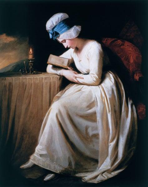 Seated woman shown in profile, reading at a table by candlelight. Depicts Serena, the heroine of the poem 'Triumphs of Temper' by the artist's friend and biographer William Hayley (1745-1820), a lady of the sweetest temper and constant good humour who is rewarded by a happy marriage. The character became a role model for fashionable ladies of the time, and was the subject of several other works by the artist.