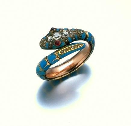 A Victorian ring formerly belonging to Mrs Catherine Dickens, who married Charles Dickens in 1836. The ring was a gift from the French artist, Count D'Orsay, a close friend of the Dickens family. The flexible body of the ring is made up of separate, individual scale sections which would have been sprung.