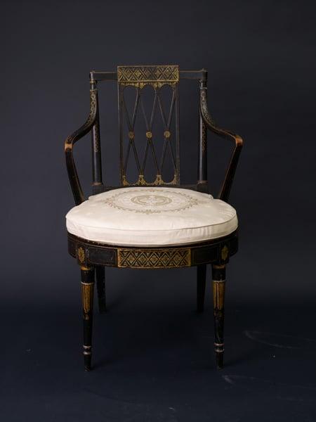 Set of five George III chairs. Ebonised and parcel gilt open armchairs, two with needlework squabs.
