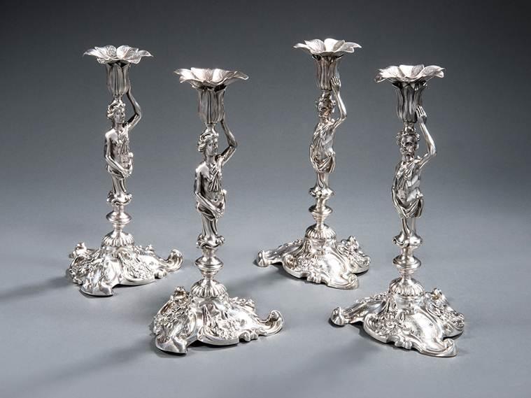 These four exceptional candlesticks were created by Thomas Heming, a freeman of the Worshipful Company of Goldsmiths who was appointed principal goldsmith to George III in 1670. The design and craftsmanship of the candlesticks is exceptional, blending the continuous movement and fluid modelling of English rococo with a naturalistic style to achieve a unique aesthetic. The stems of the candlesticks are formed from female figures in drapery that falls and folds realistically over their forms, demonstrating Heming's exceptional skill. Nearly three centuries after their creation, the silver remains crisp to the touch, a sign that the works are not only of exceptionally high quality, but also well cared for. They were commissioned by William Wasey, an eminent fellow of the Royal College of Physicians who was elected president in 1750. An entry in the college's cashbook for 1750 reads: 'September 19. President 25 Pounds being the annual donation of the late D Baldwin Hamey for a piece of Plate £25.0.0. The Treasurer of the RCP later reported that �the President had bought two pairs of chaised Candlesticks therewith�.' The 'annual donation' refers to a stipulation in the will of Dr Baldwin Hamey the Younger, one of the RCP's most generous benefactors, that 'every President shall be presented with a piece of silver plate of above three score ounces'. Despite Baldwin Hamey's insistence, Wasey's candlesticks are the only example of the provision being enacted. Baldwin Hamey's importance to the RCP, together with William Wasey's underrepresentation in their collection, makes these candlesticks a significant addition to the college.