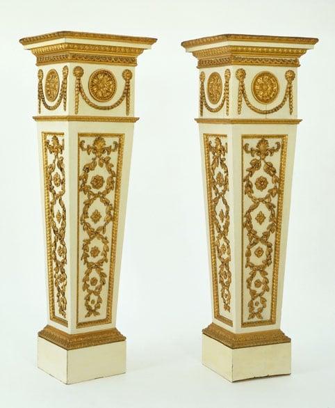 Set of six square pedestals painted white with relief ornament gilded: acanthus and vitruvian scrollwork, rosettes, festooned husks, interlaced berried laurel. Probably made by Samuel Norman. Four of the pedestals are on loan to the Iveagh bequest, Kenwood House.
