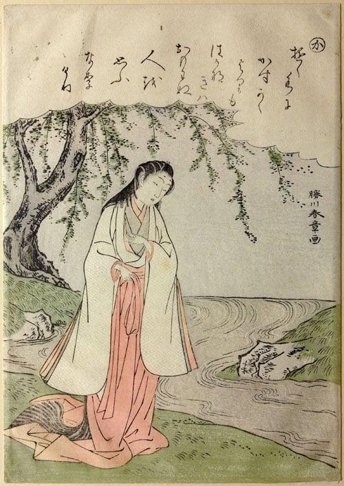 1) 'Pheasants on a pine tree', Koriusai; 2) Saigio Hoshi as a travelling priest looking towards Mount Fiyi over the back of his horse by Koriusai; 3) One of a series of illustrations to Ise Monogatari, c 1765, by Shunsho; 4) 'The actor Bando Mitsugoro I', Shunsho. Collection de Goncours; 5) 'A Chinese offical with two attendants', Toyohiro; 6) 'Lovers' Toyoshiro. 7) 'Evening party', c.1799 signed Soriaratme Hokusai.