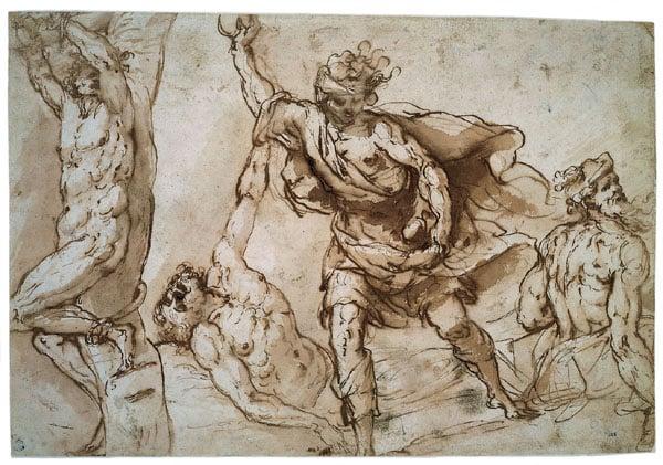 This sheet of vigorous, exploratory studies provides evidence of Venetian drawing practice in the baroque age and is convincingly attributed to Maffei. The figure studies do not relate to specific figures in known paintings by Maffei, but some motifs are similar.