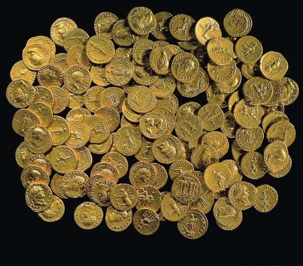 A hoard of 123 gold and 7 silver Roman coins. The gold coins represented the largest 1st-century hoard discovered in Britain and one of only a handful of large early-Imperial Roman hoards known in the Empire. The aurei were issued by seven emperors: Tiberius, Claudius, Nero, Galba, Otho, Vittellius and Vespasian. Many rare types are represented among them, along with one unique type. The coins are all in good or very fine condition. The silver coin hoard, recovered a few metres away from the gold coins, contains Republican and Imperial issues, including a coin issued by the emperor Vespasian. It is likely that the silver coin hoard was originally buried at about the same time as the gold hoard. Roman gold coin hoards are extremely rare. Both hoards suggest the late Iron Age practice of depositing groups of gold and silver items as votive offerings, as at Snettisham in Norfolk. It is likely that the site where the hoards were buried was a religious or 'cult' site.