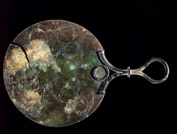 A mirror decorated in a swirling early Celtic style using engraved circles, ovals and arches, emphasised by a fine basket weave in fill. The mirror is round with a relatively simple loop handle which is typical of its time. The brooch was found in close proximity to the mirror together with some pottery shards.