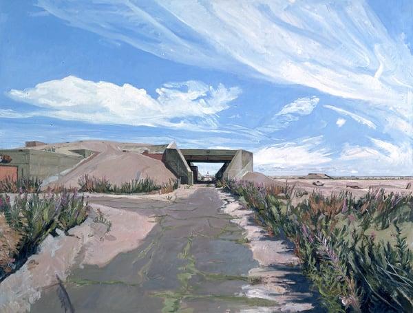 Painting of the now defunct buildings of the Atomic Weapons Research Establishment, set in the Suffolk landscape. The buildings are now public property.