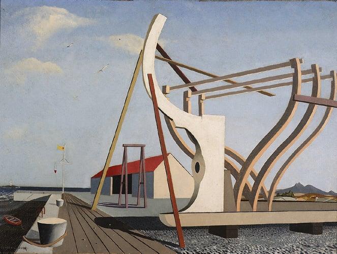The Kilkeel Shipyard looking over towards the Mournes. A Surrealist interpretation, in the stylised manner of de Chirico and British painters, Hillier and Wadsworth.