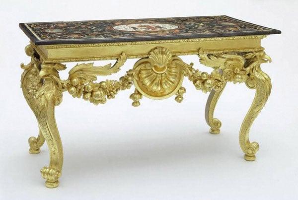 Carved and gilt side table made for Lord Lichfield. The top of many coloured scagiola, made in Italy, has the arms of him and his wife set in a design of flowers, birds etc and a harbour scene. Eagle headed scroll legs.