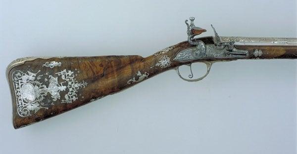 Gun signed on lock by Piraube, pre-eminent among Louis XIV's gunmakers. Barrel is entirely of silver, chiselled and engraved with foliate ornament and gilt figure of Mars at the breech. Mythological figures appear elsewhere on gun.