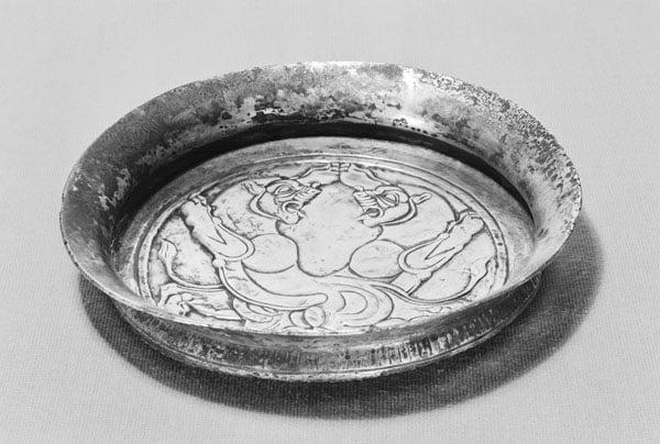 Base decorated with chased design of rampant and crossed lions in a roundel enclosed by 2 circles. Subsequently discovered to be a forgery, the bowl is ancient but the decoration is modern.