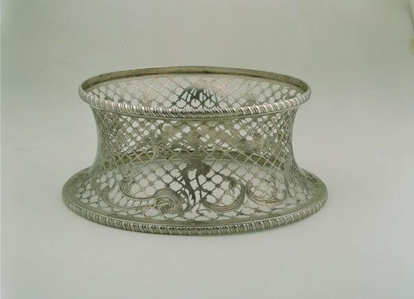 A silver dish ring, spool-shaped, pierced sides engraved with human figures.