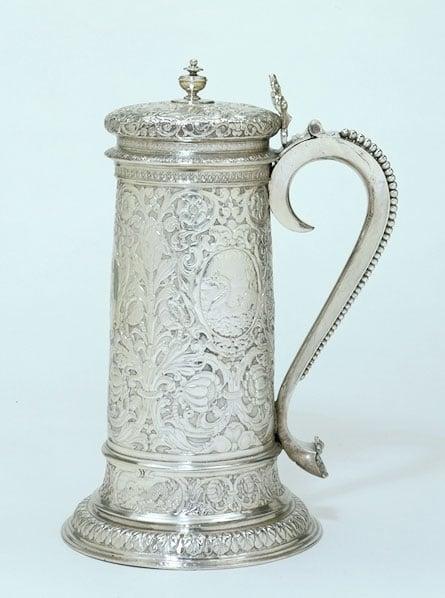 One of a pair of silver flagons from the parish church of Thirkleby, near Thirsk, Yorkshire; richly chased with floral designs and panels containing dolphins and sea-monsters. An applied plaque with the arms of F Tyssen, whose father came from Holland. Grant for two flagons, the other one was presented to Temple Newsam, Leeds.