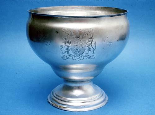 George III punch bowl with ogee in profile, moulded lip and pedestal foot. Engraved on one side, 'Henry Hegg Esqr, Mayor 1785', with coat of arms, supporters, motto, and crest of the City. Hegg, a druggist admitted to the freedom of the City of Chester in 1758 and a Councilman in 1762. It carries the hallmark of London, 1784, and the maker's mark of Hester Bateman.
