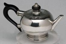 Small teapot with engraving on the top of the pot and the rim of the cover. Black handle and maker's mark on the base.