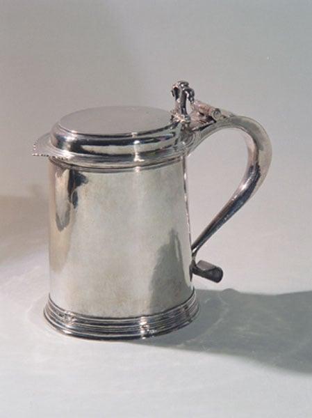A rare silver tankard, bearing the Plymouth marks of 1695-1700, the marks being eithe IM or JM (John Murch?) and Britannia, both struck twice. Handle also has the maker's marks and is pricked with IM 1795. A flat top lid, and ribbed base.