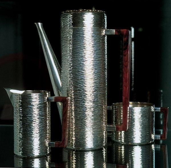 1-3) silver coffee pot, milk jug and sugar basin, 1976; 4) large ladle, 1976; 5) honey spoon, 1974; 6) Royal Silver-Wedding sphere, 1972; 7) Silver Jubilee filigree egg, 1977; 8-9) pair of candlesticks and holders, 1968-69; 10) silver sweetmeat dish, 1972. Part of a gift to 19 museums by Joan Hurst through the Art Fund in 2002.