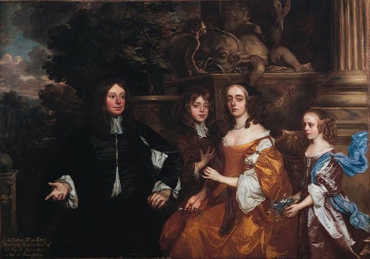 This three-quarter length group portrait presents Sir John Cotton, in black, seated to the left, with Lady Cotton, in a gold dress, to the right. Between them stands their son John, wearing a brown cloak. On the right their daughter Jane, in maroon and blue, carries a basket of flowers to her mother. The group is set against a sculptural fantasy, including a fountain with putti and a dolphin, beyond which is a wooded valley with a cascade. This work is one of Lely's finest portrait groups. in the international portrait style of the later 17th century, which derived from Van Dyck. Painted towards the end of the Commonwealth, it pre-dates the widespread popularity of the style resulting from its adoption by the French and English courts in the early 1660s.