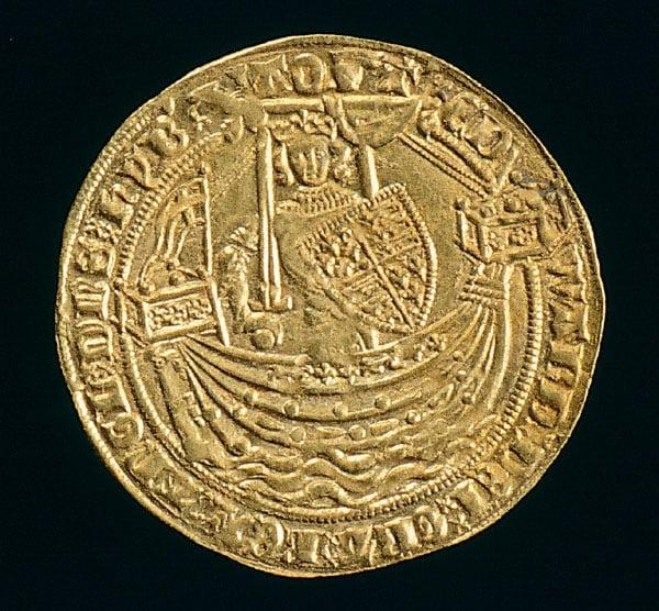 Edward III's fourth coinage. Hammered design on obverse depicts the king in a boat holding a sword and shield of arms. Numismatically significant because gold nobles of the reign of Edward III were the first gold coins produced in any quantity and generally circulated, reflecting a growing economy.