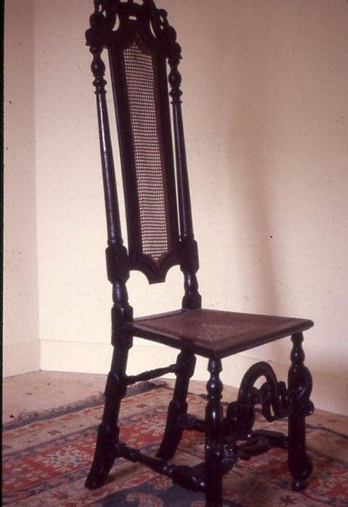 Six James VII & II dining chairs. A set of black japanned, high-backed, carved chairs, with backs and seats of cane and fringed squab cushions.