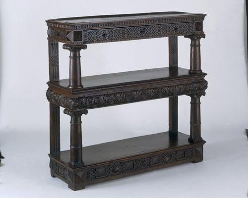 1) Firescreen in wood and gilt gesso with panel of embroidery from Bretby Hall; 2) Armchair, walnut, painted, cane seat and back from Bramshill Park; 3) Similar armchair 4) Pair of walnut bellows 5) Walnut cabinet on stand 6) Oak court cupboard. Part of a donation of 16 gifts and 1 bequest to five museums by the Brigadier Clark Fund through the Art Fund between 1936 and 1992.