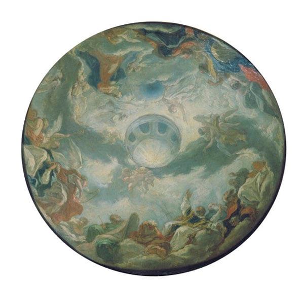 An oil sketch for the decoration of a dome, signed and dated 1710, with figures circling on clouds round an open lantern. Pellegrini visited England from 1708-1713, and was considered for the dome of St Paul's, for which this may be a sketch.
